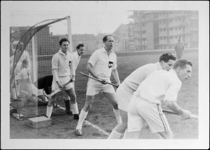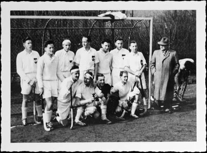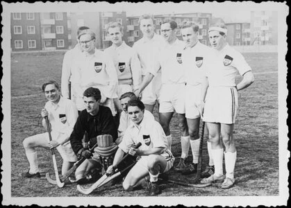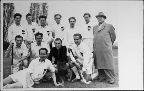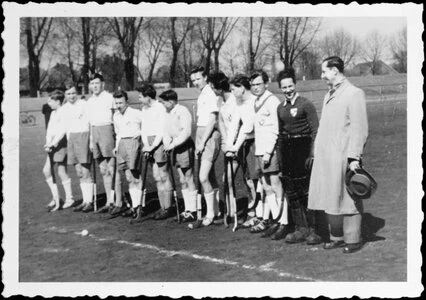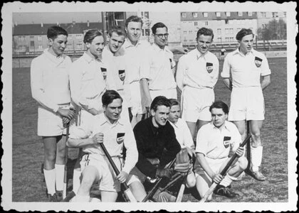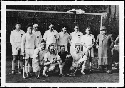 Die siegreiche Mannschaft des Buerschen HC nach dem Meisterschaftsspiel am 14.3.54 gegen den Gelsenkirchener TK auf dem Halfmannshof