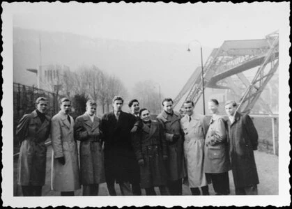 Rückkehr vom Kirchgang. Bei guter Laune zwischen Schwebebahn und Zoo-Stadion. Nach der Fahrt am Karsamstag-mittag im dichtgedrängt besetzten Bus, Ankunft u. Regen, einem 6:0-Sieg über den Veranstalter, Abendbrot und Bilderschau in der Sportschule stehen wir nun am Ostermorgen im Nebel, der langsam der aufsteigenden Sonne weicht.